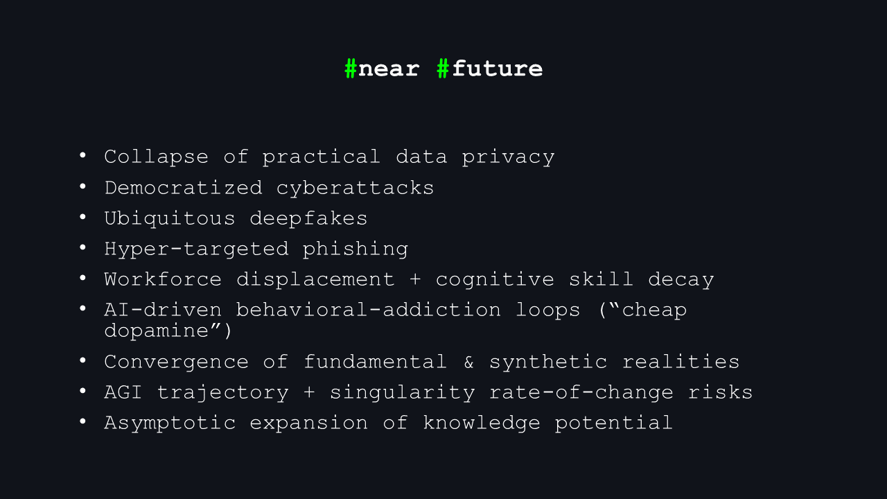 Phishing evolves into personalized, AI-generated psychological operations. Models will craft perfect imitations of voices, faces, writing styles — tailored to each individual’s psyche. Your future inbox may consist mostly of messages written precisely for you, by systems designed to exploit every cognitive bias known to neuroscience.